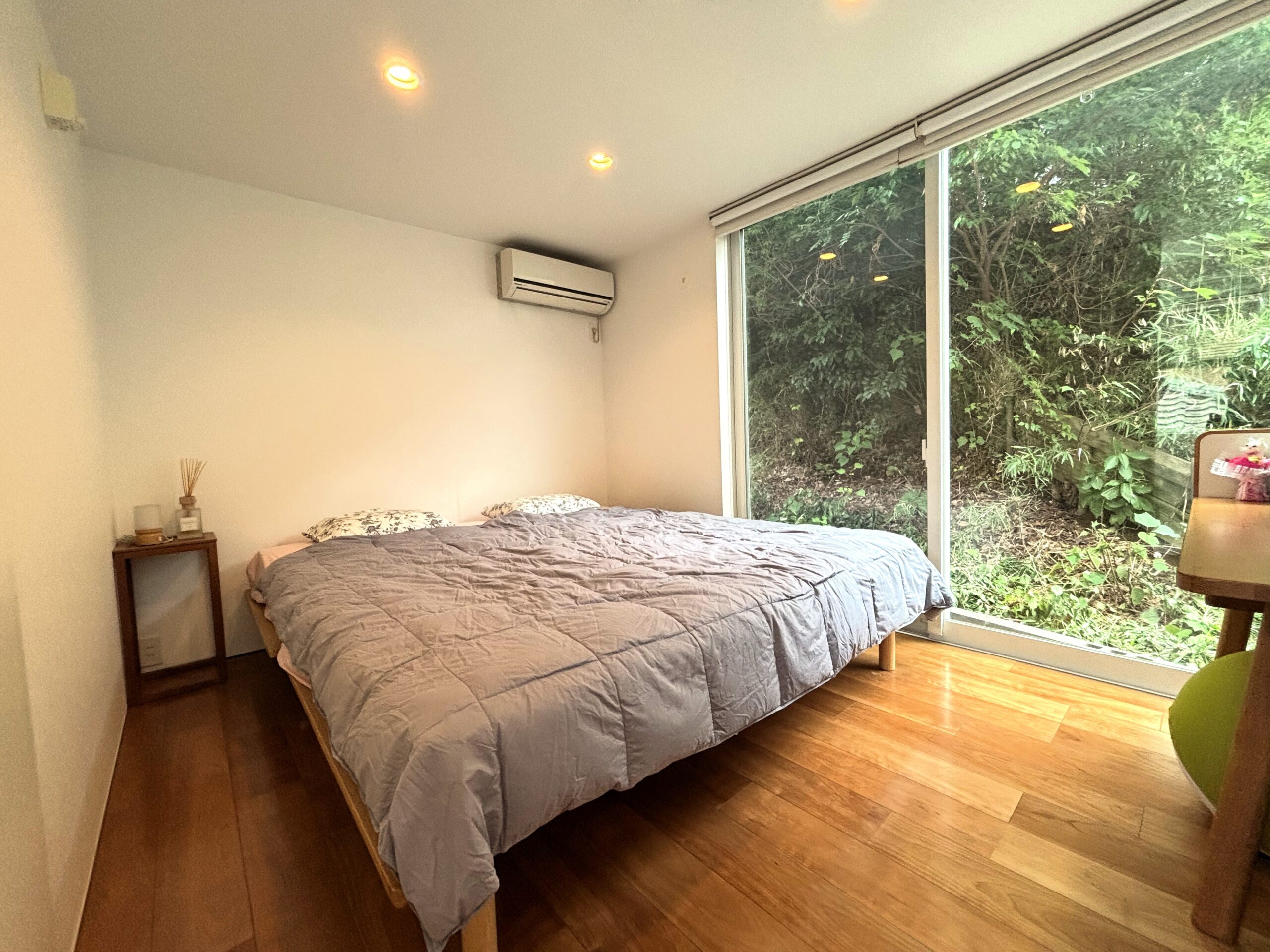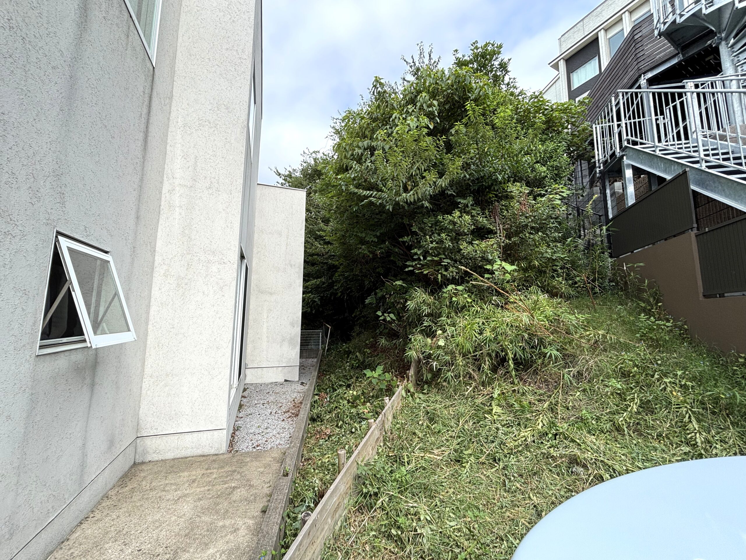 背面の崖は、自然を感じながら緑が映える静かな景観を生み出しています。千葉市の道になっています。ですので、現在、植栽の伐採を依頼中。