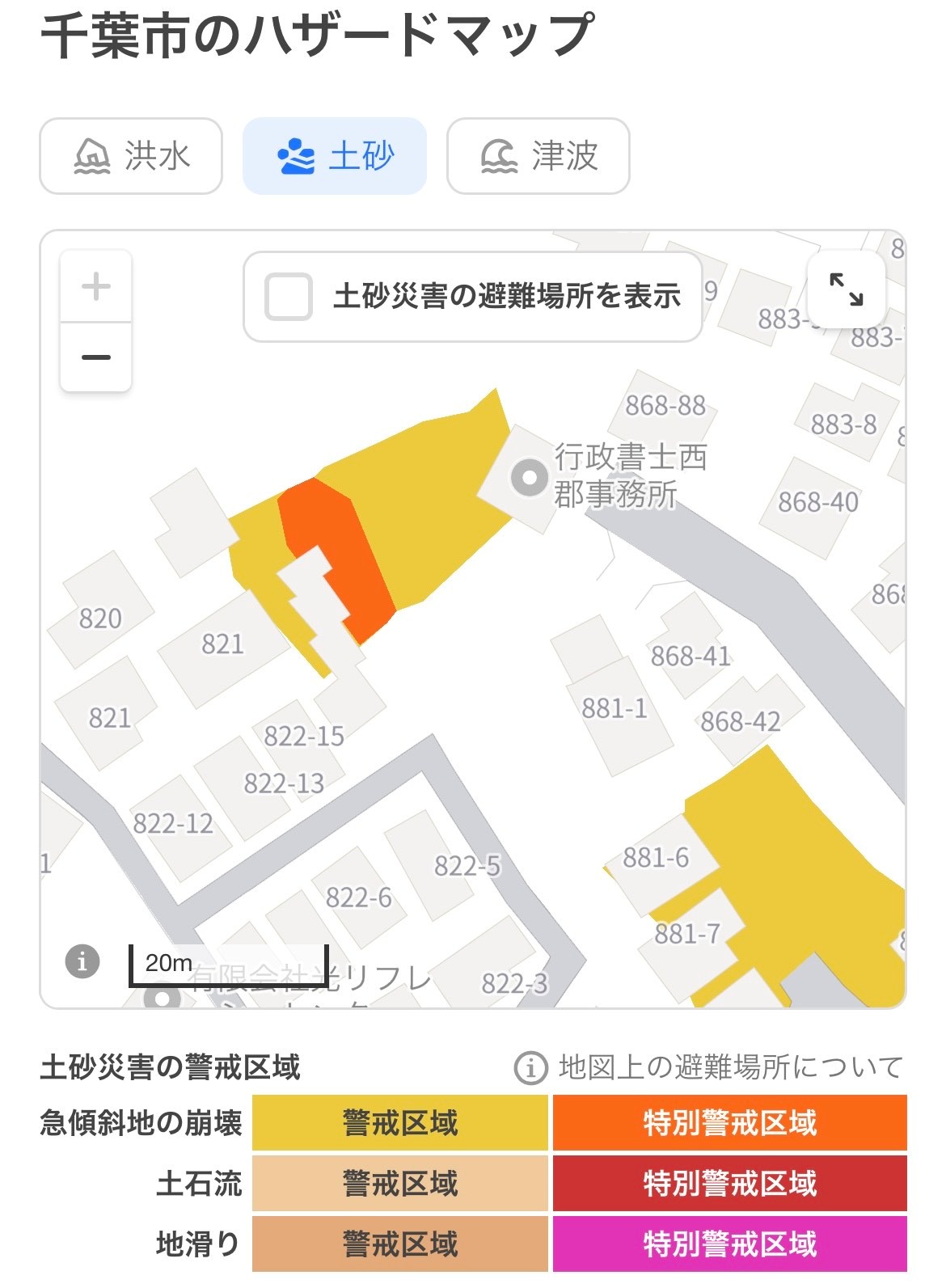 本物件は、千葉市のハザードマップにおいて土砂災害特別警戒区域(レッドゾーン)に指定されています。